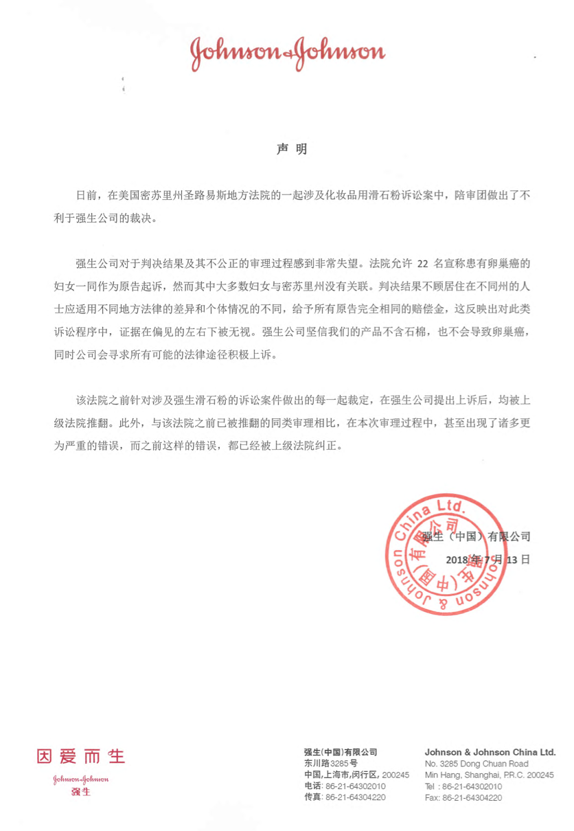 據(jù)路透社報(bào)道,近日美國(guó)密蘇里州一個(gè)陪審團(tuán)判決,22名女性對(duì)強(qiáng)生公司滑石粉產(chǎn)品(包括強(qiáng)生嬰兒爽身粉)包含石棉,導(dǎo)致患癌的指控有效,責(zé) …