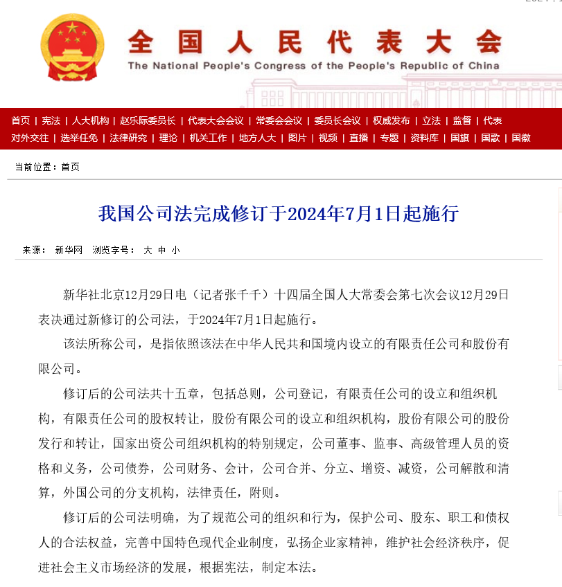2023年12月29日,十四屆全國人大常委會第七次會議修訂通過《中華人民共和國公司法》,自2024年7月1日起施行。此次修訂對于完善中國特色現(xiàn)代企業(yè)制度,推動資本市場健康發(fā)展,助力經(jīng)濟(jì)高質(zhì)量發(fā)展具有重要意義。